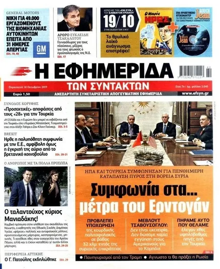 "Ef.Syntakton" gazetesi de diğer gazeteler gibi anlaşmanın Türkiye'nin lehinde olduğunu belirten manşeti altındaki haberinde Dışişleri Bakanı Mevlüt Çavuşoğlu'nun "Bu anlaşmanın ateşkes anlaşması olmadığını, operasyonlara ara verildiğini ve Kobani konusunda ABD'ye hiçbir güvence verilmediğini açıkladığını" yazdı.