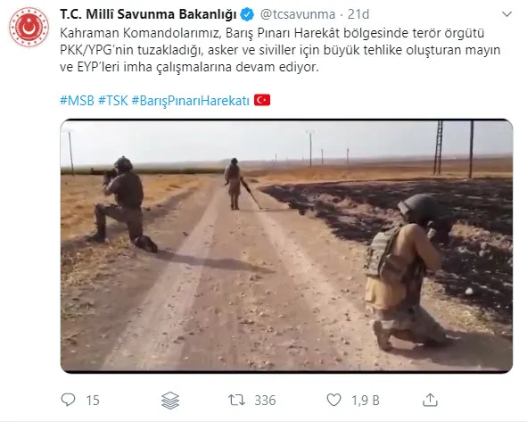 Bakanlığın Twitter hesabından yapılan açıklamada, "Kahraman Komandolarımız, Barış Pınarı Harekât bölgesinde terör örgütü PKK/YPG'nin tuzakladığı, asker ve siviller için büyük tehlike oluşturan mayın ve EYP'leri imha çalışmalarına devam ediyor" denildi.