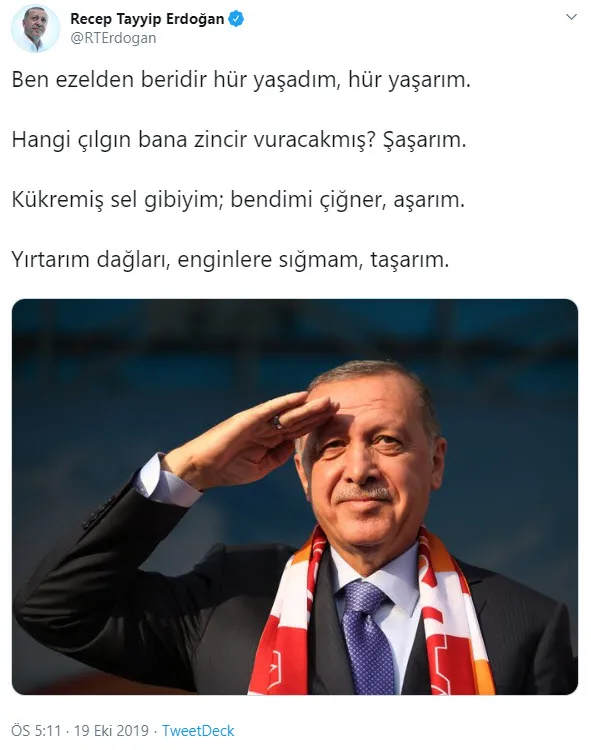Başkan Recep Tayyip Erdoğan, Başkan Recep Tayyip Erdoğan, Kayseri'deki toplu açılış törenininde yaptığı konuşmanın ardından cephede bulunan kahraman Mehmetçiği ve vatandaşları asker selamı ile selamladı. Başkan Erdoğan asker selamı pozunu, resmi Twitter hesabından İstiklal Marşı'ndan 4 dize ile paylaştı.