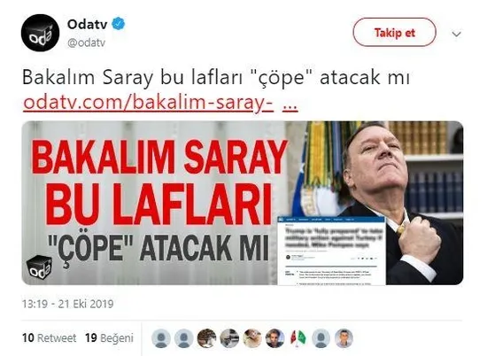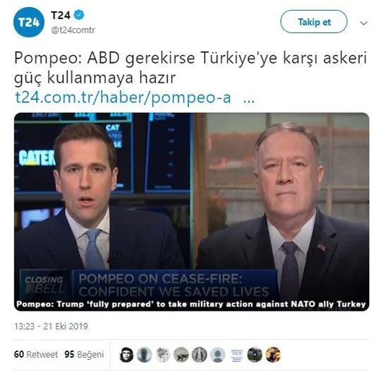 ABD Dışişleri Bakanı Mike Pompeo, Türkiye ile Suriye'nin kuzeyinde varılan ateşkese ilişkin açıklamada bulundu. Pompeo, Donald Trump'ın gerektiğinde askeri seçeneği kullanmaya hazır olduğunu söyledi. Ancak CNBC kanalı, haber başlığında "Trump gerektiğinde Türkiye'ye karşı askeri eyleme geçmeye tamamen hazır" ifadelerine yer verdi. Bu olayı fırsat bilen Cumhuriyet, OdaTV ve T24 gibi internet siteleri de CNBC'nin çarpıttığı skandal habere ve algı operasyonuna göz göre göre ortak oldu.
