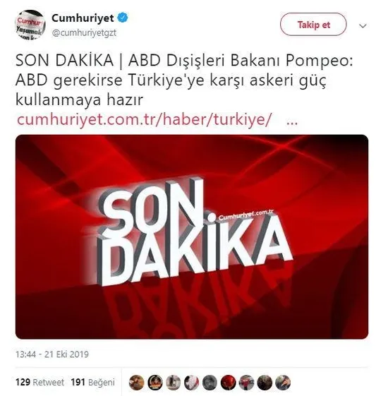 CNBC'nin imza attığı büyük skandalı fırsat bilen yalan medyası Pompeo'nun sözde Türkiye açıklaması haberinin doğruluğunu araştırmadan algı operasyonuna başladı. CNBC'nin skandal haberine Cumhuriyet, Oda TV ve T24 gibi internet siteleri göz göre göre ortak oldu.