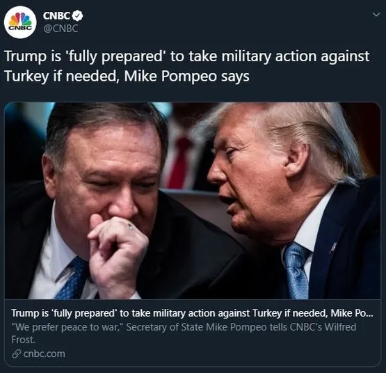 CNBC kanalı ise, haber başlığında "Trump gerektiğinde Türkiye'ye karşı askeri eyleme geçmeye tamamen hazır" ifadelerine yer verdi. Ancak Pompeo'nun askeri müdahale konusundaki açıklamasında Türkiye'nin adının yer almadığı görüldü.