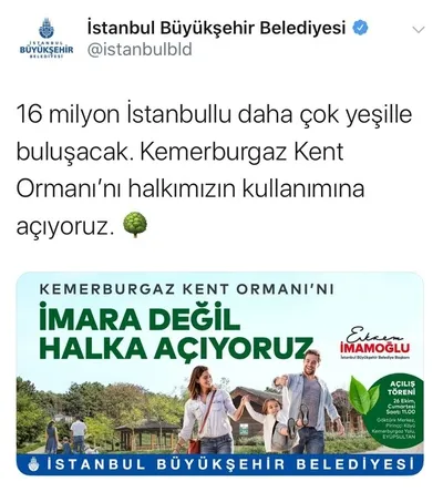 Hal böyleyken Kemerburgaz Kent Ormanı'nı, yeni yapılmış veya daha önce imara açılıyormuş gibi lanse ederek, "İmara değil, halka açıyoruz" şeklinde sosyal medya paylaşımları yapmanın halkı yanlış bilgilendirmekten öte başka bir amacının olmadığı aşikardır.