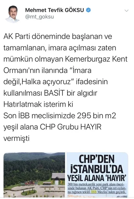 "Kemerburgaz Kent Ormanı'nın açılış daveti ilanında hem iftira hem de akıl almaz bir yalanla karşı karşıyayız" diyen M. Tevfik Göksu, "Davette 'İmara değil halka açıyoruz' deniyor. Sanki birileri burayı imara açmaya çalışmış da kendileri kurtarmış gibi basit bir algı operasyonu yapılıyor! Bakınız bu tamamen iftira ve yalandır. Bunu söyleyebilmek için çok insafsız olmak gerekiyor. Çünkü bu alan zaten orman arazisidir. Bu arazi 2012 yılında kent parkı yapılmak üzere İBB tarafından Orman Bakanlığı'ndan devralınıyor. 2015 yılında ise kent ormanının yapımına başlanıyor. AK Parti belediyeciliği tarafından 3 yıl gibi kısa bir zamanda tamamlanan Kemerburgaz Kent Ormanı'nın sadece ve sadece açılışı kalıyor. Seçim döneminde AK Parti'nin etik siyaset anlayışı gereği açılışı yapılmayıp tehir ediliyor. Bu devasa hizmetin açılışı da bugüne kalıyor. Bizim, bu dev hizmetin açılışının yapılmasına tabii ki itirazımız yok. Olamaz da. Burada yanlış olan ve İstanbul halkının yanıltıldığı konu, geçmiş dönemde yapılan bir hizmeti kendisi yapmış ve üstelik 'imara açılmaktan kurtarmış' gibi basit bir algıya başvurmuş olmasıdır. Millete hizmet konusunda hiç bir zaman samimi olmadıkları gibi bu konuda da samimi değiller" ifadelerini kullandı.