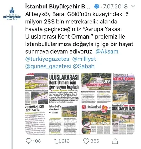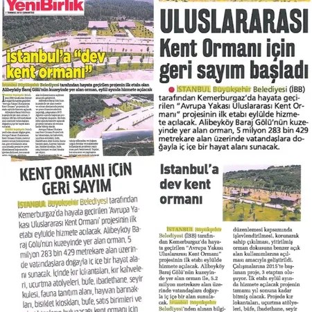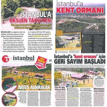 İstanbul Büyükşehir Belediyesi'nin, sosyal paylaşım sitesi Twitter'da resmi hesabından 7 Temmuz 2018 tarihinde; "Alibeyköy Baraj Gölü'nün kuzeyindeki 5 milyon 283 bin metrekarelik alanda hayata geçireceğimiz 'Avrupa Yakası Uluslararası Kent Ormanı' projemiz ile İstanbullularımıza doğayla iç içe bir hayat sunmaya devam ediyoruz" paylaşımda bulunmuş. Söz konusu paylaşımda, Sabah, Güneş, Milliyet, Türkiye ve Akşam gazetelerinde yer alan haberlerde, Kemerburgaz Kent Ormanı'nın için geri sayımın başladığına dikkat çekiliyor.