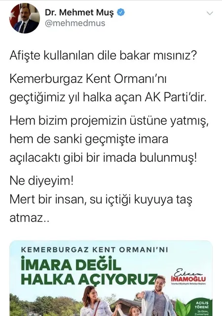 AK Parti Grup Başkanvekili ve İstanbul Milletvekili Dr. Mehmet Muş da, Ekrem İmamoğlu'nu eleştirdi ve "Afişte kullanılan dile bakar mısınız? Kemerburgaz Kent Ormanı'nı geçtiğimiz yıl halka açan AK Parti'dir. Hem bizim projemizin üstüne yatmış, hem de sanki geçmişte imara açılacaktı gibi bir imada bulunmuş! Ne diyeyim! Mert bir insan, su içtiği kuyuya taş atmaz.." ifadelerini kullandı.
