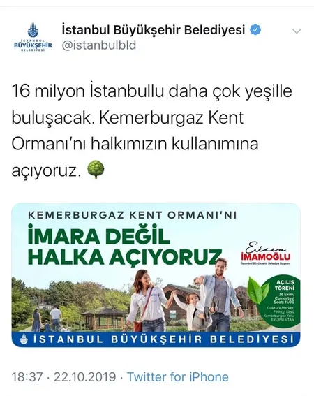 İstanbul Büyükşehir Belediye Başkanı Ekrem İmamoğlu, bugün açılışı yapılacak Kemerburgaz Kent Ormanı hakkında gerçek dışı bilgiler verdiği öğrenildi. Ekrem İmamoğlu’nun; ‘İmara değil halka açıyoruz’ şeklinde tanıtımda bulunduğu ve kendi döneminde yapıldığını iddia ettiği Kemerburgaz Kent Ormanı’nın, Kadir Topbaş ve Mevlüt Uysal’ın İstanbul Büyükşehir Belediye Başkanı olduğu döneminde yapıldığı bildirildi.
