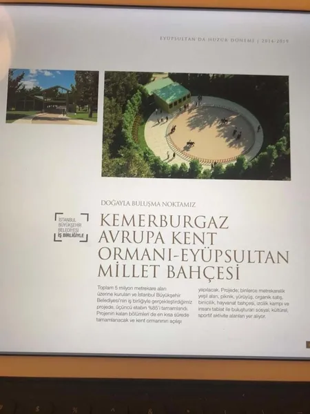 Kitapçığın; "Kemerburgaz Avrupa Kent Ormanı-Eyüpsultan Millet Bahçesi" başlıklı bölümünde, "Toplam 5 milyon metrekare alan üzerine kurulan ve İstanbul Büyükşehir Belediyesi'nin işbirliğinde gerçekleştirdiğimiz projede, üçüncü etabın yüzde 85'i tamamlandı. Projenin kalan bölümleri de en kısa sürede tamamlanacak ve kent ormanının açılışı yapılacak. Projede; binlerce metrekarelik yeşil alan, piknik, yürüyüş, organik satış, binicilik, hayvanat bahçesi, izcilik kampı ve insanı tabiatı ile buluşturan sosyal, kültürel, sportif aktivite alanları yer alıyor" ifadeleri yer alıyor.