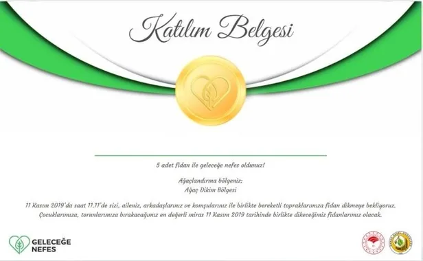 Geleceğe Nefes katılım belgesi almak için yapmanız gereken işlemler çok basit. 'FİDAN SAHİPLEN' butonuna tıkladığınızda isim soyisim ve e-posta girdikten sonra istediğiniz şehirde adınıza ücretsiz 5 fidan dikimi yapılıyor. 11 Kasım fidan dikme etkinliğine aynı anda tüm Türkiye'de gerçekleştirilecek; yeşilin her tonuyla toprağa hayat, canlılara nefes olacak bu anlamlı çevre seferberliğine tüm vatandaşlar davetlidir.