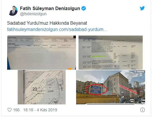 "31 Ekim'de, Kağıthane'deki Sabadad Talebe Yurdu'muzun yıkılması beni çok üzdü. Sonrasında çıkan videolar, görseller, yazıları görünce müthiş bir şekilde derinden yaralandım. Ertesi gün bu konuyla ilgili Ankara'da önemli görüşmeler yaptım, o yüzden anca cuma akşamında Kağıthane Belediye Başkanımız Sayın Mevlüt Öztekin Bey ve Başkan Yardımcılarıyla toplantı yapabildik. Toplantı esnasında bilgi, belge dokümanları elde ettiğimde ve olayları birinci ağızdan dinlediğimde bu kadar mı olur dedim? Bu kadar mı dezanformasyon yapılır, bu kadar mı algı operasyonu yapılır, Süleymanlı Cemaatimizin bazı idarecileri tarafından her sunulan bilgi ve belge bu kadar mı gerçek dışı olur?
