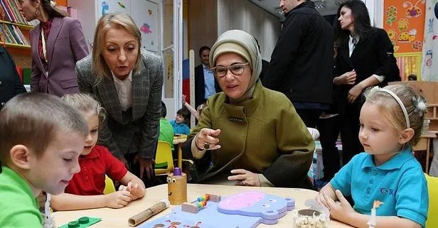 Macaristan ziyaretinde Cumhurbaşkanı Erdoğan'a eşlik eden Emine Erdoğan, Budapeşte'de Türk İşbirliği ve Koordinasyon Ajansı Başkanlığı (TİKA) tarafından donanım desteği verilen Kispet Gökkuşağı Anaokulu'nu ziyaret etti.