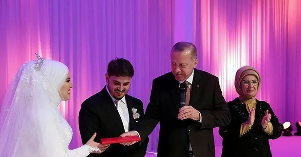 Çifte mutluluk dileyen Cumhurbaşkanı Erdoğan, evlilik cüzdanını geline takdim etti.