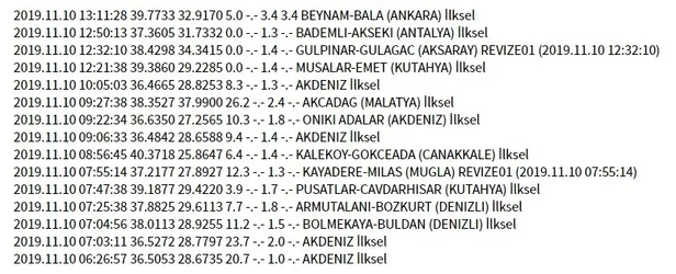 KANDİLLİ RASATHANESİ VE AFAD SON DEPREMLER LİSTESİ - 10 KASIM