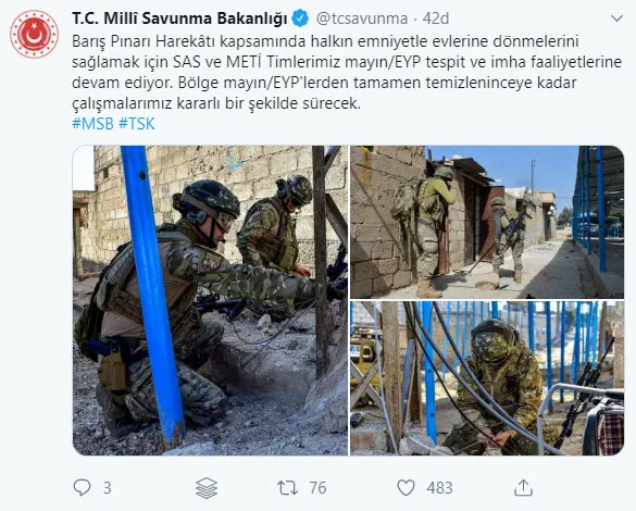 Bakanlığın Twitter hesabından yapılan açıklamada, "Barış Pınarı Harekâtı kapsamında halkın emniyetle evlerine dönmelerini sağlamak için SAS ve METİ timlerimiz mayın, EYP tespit ve imha faaliyetlerine devam ediyor. Bölge mayın, EYP'lerden tamamen temizleninceye kadar çalışmalarımız kararlı bir şekilde sürecek" denildi.