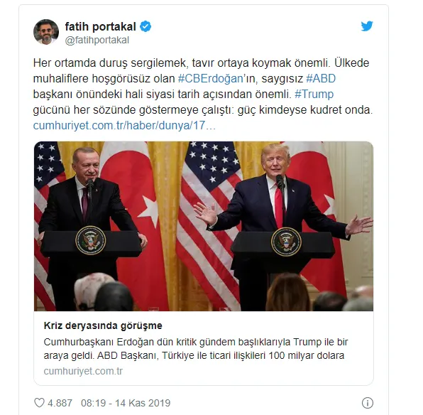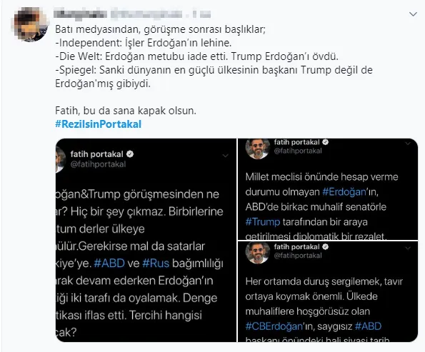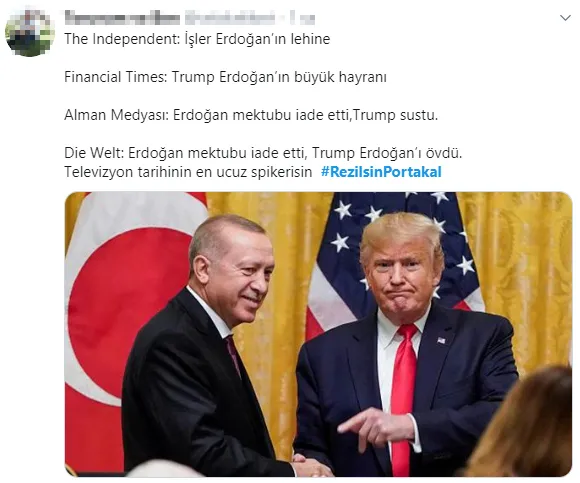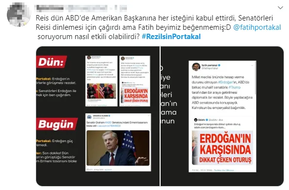 Kullanıcılar ayrıca Portakal'a CNN'in Beyaz Saray muhabiri olan Kevin Liptak "Ancak hiçbir lider, Erdoğan kadar, Trump'tan istediğini elde edemedi" yorumunu hatırlattı. ABD basınında Erdoğan'a hayran olduğunu söyleyen Trump'ın sözlerinin Batı basınında manşetlere taşınması da paylaşıldı.