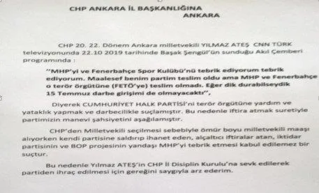 "CHP FETÖ'ye teslim oldu" deyince partiden apar topar ihraç edilen Yılmaz Ateş'in disiplin süreci ve savunması ortaya çıktı