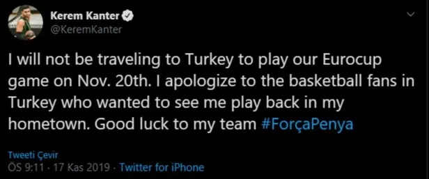 Kerem Kanter, sosyal medya hesabı üzerinden yaptığı açıklamada, "20 Kasım'daki Eurocup maçımız için Türkiye'ye gelmeyeceğim. Tekrar beni izlemek isteyen seyircilerden özür dilerim. Takımıma başarılar dilerim." ifadelerini kullandı.