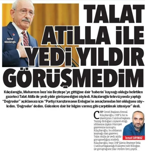 Başkan Erdoğan'ın "CHP'yi yalan üretme merkezi haline getirdi" dediği CHP Genel Başkanı Kemal Kılıçdaroğlu, Hürriyet Gazetesi'ne yaptığı açıklamada CHP'li Muharrem İnce’nin Beştepe’ye gittiğine dair haberin kaynağı olduğu belirtilen gazeteci Talat Atilla ile yedi yıldır görüşmediğini söyledi. Kılıçdaroğlu'nun "7 yıldır telefonda bile görüşmedim" dediği Talat Atilla ile 1 yıl önce görüştü ortaya çıktı. Sözcü'nün kanıtsız bir kulis haber yayınlayarak gündemin karışmasına sebep olmasından sonra Hürriyet Gazetesi'nin ve İsmail Saymaz'ın da benzer bir hata ile konuyu daha da bulandırması tepki çekti.