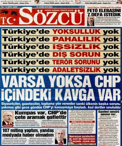 Sözcü Gazetesi, sanki CHP kaynaklı kurgu haberi kendi köşesinden yayınlamamış ve günlerce savunmamış gibi diğer gazeteleri suçladı. Gazete, "Türkiye'de yoksulluk, pahalılık, işsizlik, dış sorun, terör sorunu, adaletsizlik yok, varsa yoksa CHP içindeki kavga" manşetini atarak henüz birkaç gün önceki yalan haber skandalını örtbas etme ve hedef saptırma peşine düştü.