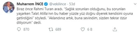 Muharrem İnce Twitter'dan duyurdu: Biraz önce Rahmi Turan aradı
