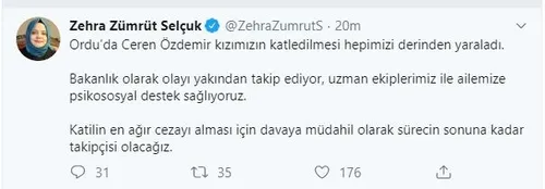 Bakanlığın olayı yakından takip ettiğini kaydeden Selçuk, "Uzman ekiplerimiz ile ailemize psikososyal destek sağlıyoruz. Katilin en ağır cezayı alması için davaya müdahil olarak sürecin sonuna kadar takipçisi olacağız." ifadesini kullandı.
