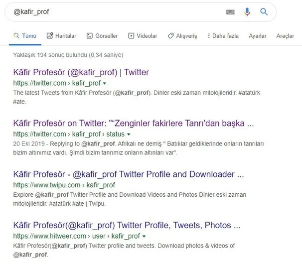 Sosyal paylaşım sitesi Twitter'da 'Kâfir Profesör (@kafir_prof)' isimli hesaptan bir süredir gerek dini değerlere gerekse de devlet büyüklerine yönelik eleştiri sınırlarını aşan aşağılayıcı paylaşımlar yapılıyordu. Şikâyet üzerine Kâfir Profesör hesabı takibe alınıp kim tarafından kullanıldığı araştırıldı.