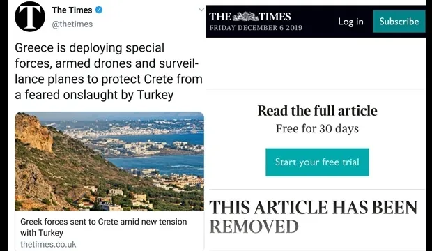 İngiliz The Times, Yunanistan’ın Girit Adasını keşif uçakları, drone ve özel kuvvetlerin donattığını bunun gerekçesinin ise Türkiye tarafından gelecek olan saldırı olduğunu belirten skandal bir makale yayınladı. Ancak gelen tepkiler üzerine makale siteden tamamen kaldırıldı.