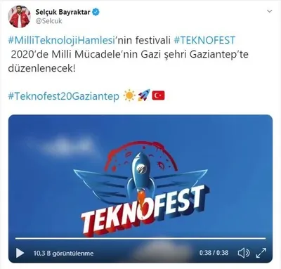 Sosyal medya hesabından açıklama yapan Baykar'ın Teknik Müdürü Selçuk Bayraktar, "Milli Teknoloji Hamlesi'nin festivali Teknofest, 2020'de Milli Mücadele'nin Gazi şehri Gaziantep'te düzenlenecek" ifadelerini kullandı.