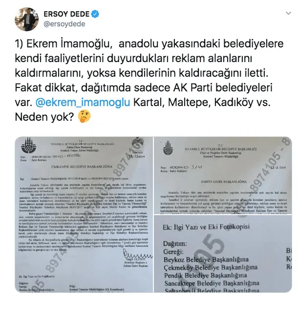 "1) Ekrem İmamoğlu, anadolu yakasındaki belediyelere kendi faaliyetlerini duyurdukları reklam alanlarını kaldırmalarını, yoksa kendilerinin kaldıracağını iletti. Fakat dikkat, dağıtımda sadece AK Parti belediyeleri var. Ekrem İmamoğlu Kartal, Maltepe, Kadıköy vs. Neden yok?