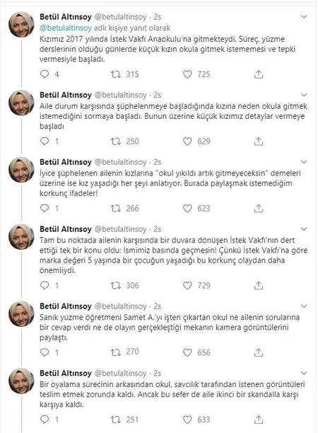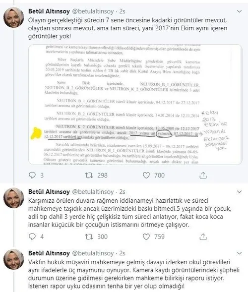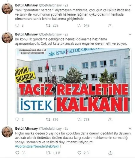 İstek Vakfı okulunda 5 yaşındaki çocuğa cinsel istismar davasında görüntülerin mahkemeye gitmemesi ve İstek Vakfı tarafından rezaletin üstünün kapatılmaya çalışılması davanın avukatı Betül Altınsoy'u isyan ettirdi. Müşteki ailenin avukatı Betül Altınsoy Twitter'dan yaptığı açıklamada olayın gerçekleştiği sürecin 7 sene öncesine kadarki görüntülerin mevcut olduğunu ancak olayın gerçekleştiği tarihte yani Ekim 2017'deki görüntülerin silindiğini veya gizlendiğini belirtti. Altınsoy, sosyal medya hesabından yaptığı paylaşımda görüntülerin mahkemece istenmemesine itiraz ederek "Hiçbir marka değeri 5 yaşında bir çocuktan daha önemli değildir! Bu davanın avukatı olarak önümüze örülen duvara karşı sizden mahkemenin sormadığı soruyu sormanızı ve sesimizi duyurmanızı istiyorum" dedi.