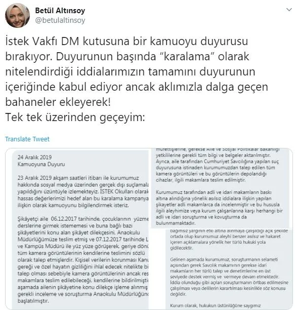 İstek Vakfı okulunda 5 yaşındaki çocuğa cinsel istismar davasında görüntülerin mahkemeye gitmemesi ve İstek Vakfı tarafından rezaletin üstünün kapatılmaya çalışılması davanın avukatı Betül Altınsoy'u isyan ettirdi. Vakıf, yaptığı açıklamada tüm görüntü kayıtlarının eksiksiz olarak verildiğini, delil karartma ve örtbas gibi bir durumun asla söz konusu olmadığını iddia etti. Vakfın açıklamasına ilişkin bir açıklama daha yapan avukat Betül Altınsoy, "Duyurunun başında “karalama” olarak nitelendirdiği iddialarımızın tamamını duyurunun içeriğinde kabul ediyor ancak aklımızla dalga geçen bahaneler ekleyerek!" dedi.