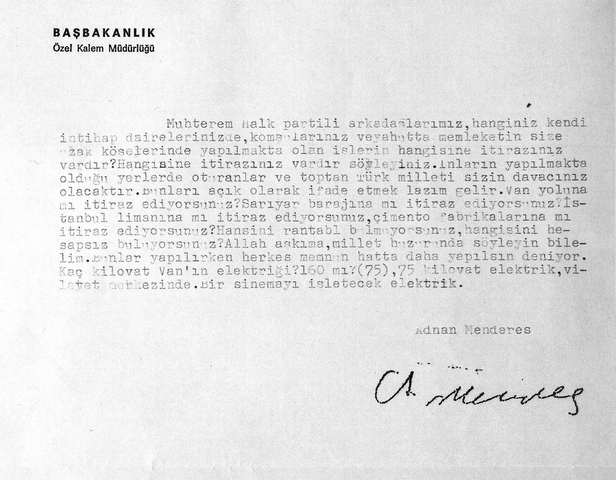 Başbakanlık arşivlerinden çıkan bir belge de Menderes'in, CHP'ye isyanını ortaya koydu. Ulaşılan belgede Menderes CHP'lilere böyle sesleniyor: "Muhterem Halk Partili arkadaşlarımız, hanginiz kendi intihap dairelerinizde, komşularınız veyahut da memleketin size uzak köşelerinde yapılmakta olan işlerin hangisine itirazınız vardır? Hangisine itirazınız vardır söyleyiniz. Bunların yapılmakta olduğu yerlerde oturanlar ve toptan Türk milleti sizin davacınız olacaktır. Bunları açık olarak ifade etmek lazım gelir. Van yoluna mı itiraz ediyorsunuz? İstanbul limanına mı itiraz ediyorsunuz? Çimento fabrikalarına mı itiraz ediyorsunuz? Hangisini rantabl bulmuyorsunuz, hangisini hesapsız buluyorsunuz? Allah aşkına, millet huzurunda söyleyin bilelim. Bunlar yapılırken herkes memnun hatta yapılsın deniyor…."