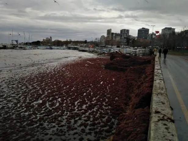 Caddebostan’dan Maltepe’ye kadar uzanan sahil kesimi kızıl renge büründü. Kırmızı yosunlar lodos nedeniyle sahile vurup kayalıkların üzerini kapladı. Kızıla bürünen Caddebostan Sahili havadan görüntülendi. Konuyla ilgili açıklama yapan İstanbul Üniversitesi Su Bilimleri Fakültesi Dekanı Prof. Dr. Meriç Albay, "Marmara'nın su kalitesinin, su sağlığı bakımından iyi olmadığını gösteriyor" dedi.