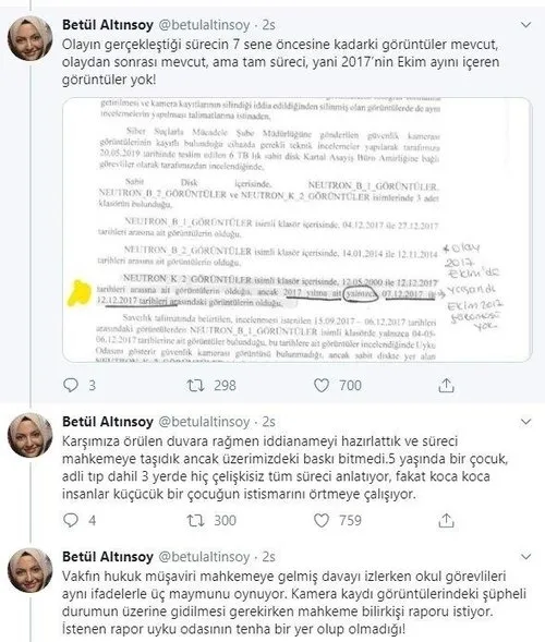 İstek Vakfı okulunda 5 yaşındaki çocuğa cinsel istismar davasında görüntülerin mahkemeye gitmemesi ve İstek Vakfı tarafından rezaletin üstünün kapatılmaya çalışılması davanın avukatı Betül Altınsoy'u isyan etmişti. Müşteki ailenin avukatı Betül Altınsoy Twitter'dan yaptığı açıklamada olayın gerçekleştiği sürecin 7 sene öncesine kadarki görüntülerin mevcut olduğunu ancak olayın gerçekleştiği tarihte yani Ekim 2017'deki görüntülerin silindiğini veya gizlendiğini belirtmişti. Cinsel istismar davasında mağdurenin ailesinin 6 Aralık 2017'de şikayet dilekçesi verdiği ama 6 Aralık da dahil 2017 yılının geriye dönük tüm görüntülerinin kayıp olduğu ortaya çıktı.