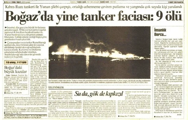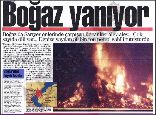 Güney Kıbrıs bandıralı Nassia ve Shipbroker tankerlerinin çarpışması sonucu 29 denizci hayatını kaybetti. Boğaza ise toplam 13 bin ton petrol aktı. Boğaz trafiğe kapatıldı.