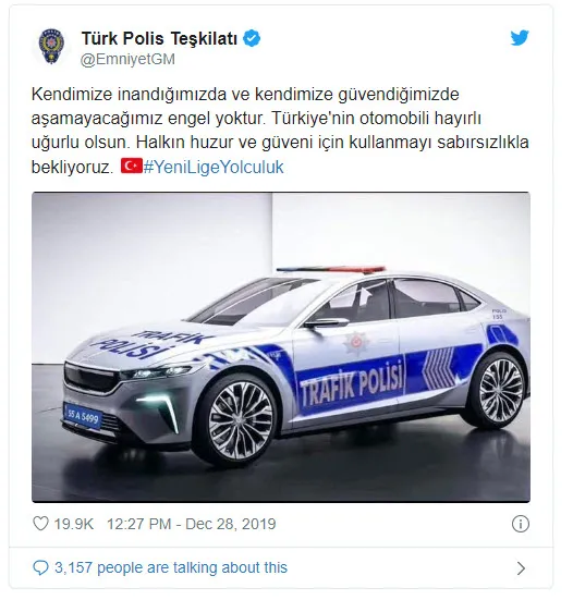 EGM'nin resmi Twitter hesabından, "C-SEDAN" modelinin fotomontaj yöntemiyle ekip otosuna dönüştürülmüş halinin fotoğrafıyla yapılan paylaşımda, "Kendimize inandığımızda ve kendimize güvendiğimizde aşamayacağımız engel yoktur. Türkiye'nin Otomobili hayırlı uğurlu olsun. Halkın huzur ve güveni için kullanmayı sabırsızlıkla bekliyoruz." ifadesine yer verildi.