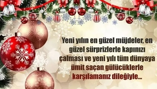 Sevgi bestesinin tınılarını tüm insanların yüreğinde hissedeceği, hüzünlerinizin dostluklarla silineceği, ümitlerinizin hiç bitmeyeceği, sağlık, mutluluk ve başarı dolu bir yılı sevdiklerinizle birlikte geçirmeniz dileğiyle. Yeni yıl size sağlık, mutluluk, başarı ve bol kazanç getirsin! Neşe dolu bir yıl geçirin!