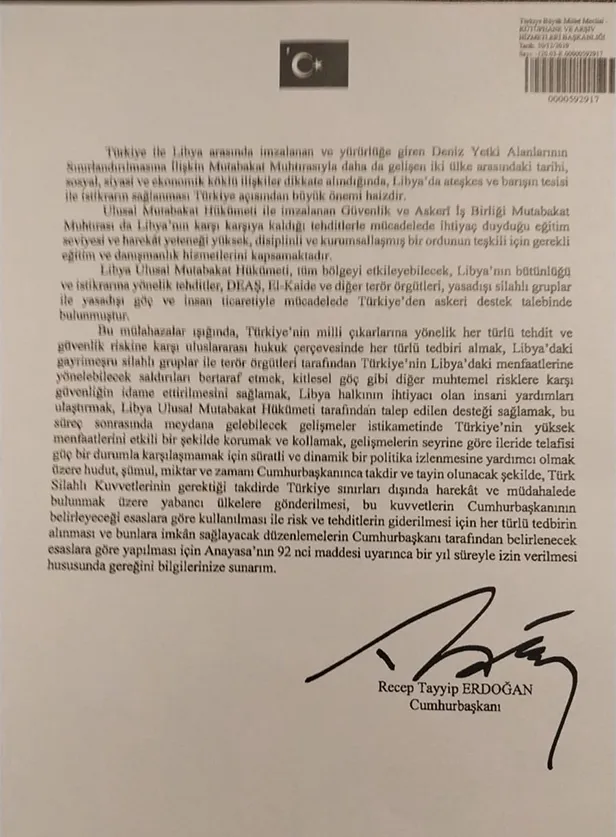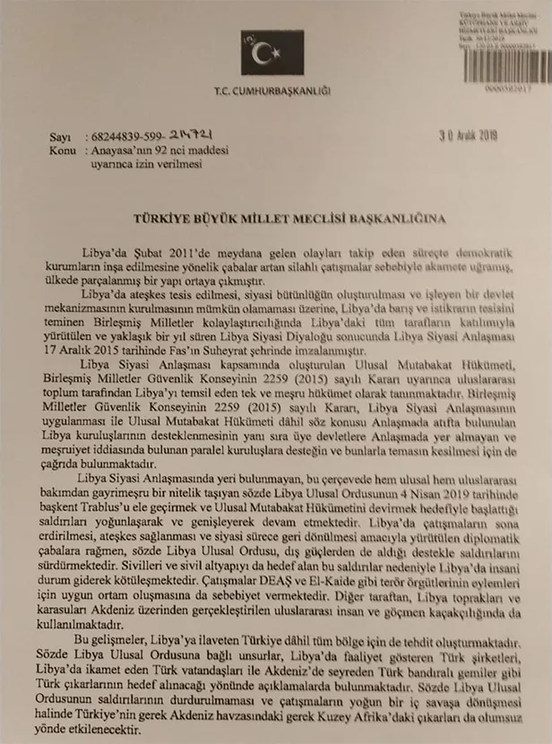 Cumhurbaşkanı Erdoğan imzalı 2 sayfalık tezkerede Libya'daki gelişmelerin bölge için tehdit olduğu belirtilerek şu ifadelere yer verildi:
