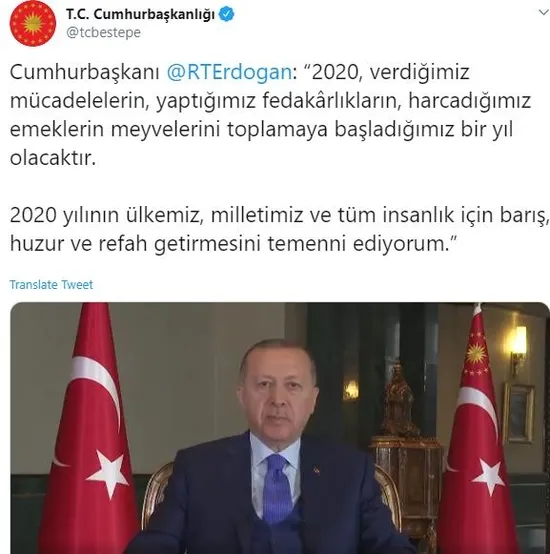 Başkan Recep Tayyip Erdoğan, bir yeni yıl mesajı paylaşarak geride bıraktığımız 2019 yılını değerlendirdi. Erdoğan, "Dün Türkiye’yi kaosla, terörle, darbeyle, krizle, istikrarsızlıkla tehdit edenler, bugün attığımız adımlar karşısındaki çaresizliklerini itiraf ediyor, uzlaşma yolları arıyor. Hep söylediğim gibi, bizim en büyük gücümüz birliğimiz, dayanışmamızdır. Bunun için her fırsatta BİR olacağız, İRİ olacağız, DİRİ olacağız, KARDEŞ olacağız, hep birlikte TÜRKİYE olacağız diyoruz." dedi.