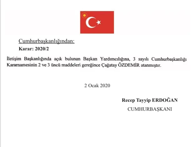 Resmî Gazetede yayımlanan 2020/2 sayılı karar uyarınca Cumhurbaşkanı Recep Tayyip Erdoğan tarafından Dr. Çağatay Özdemir, Cumhurbaşkanlığı İletişim Başkanlığı Başkan Yardımcılığına atandı.