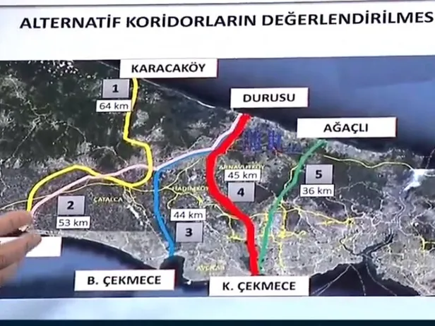Bu kanalın yerinin tespiti de önemli. Bu kanalın inşa edilebileceği 5 adet güzergahımız var. Bu güzergahlar arazide, sahada araştırıldı, incelendi. Bunlar bir ulaşım projesinde, karayolu olsun demiryolunda olsun yapılan çalışmalardır. Biz Küçükçekmece-Durusu koridoruna karar verdik. Diğer alanlar su hatlarına daha çok zarar veriyordu. Bazılarında bunların kazı miktarı, yapım maliyeti, çevreye etkileri mukayese edildiğinde, İstanbul için çok önemli orman ve su kaynağı bizim için çok önemliydi. Diğer alternatifler İstanbul'un su kaynaklarına bizim belirlediğimiz güzergahtan daha olumsuz etki yapıyordu.