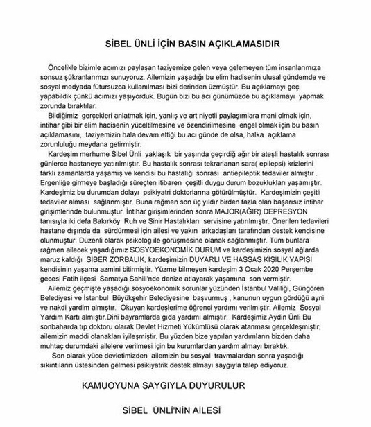 Ailenin yazılı açıklaması şu şekilde: "Öncelikle bizimle acımızı paylaşan taziyemize gelen veya gelemeyen tüm insanlarımıza sonsuz şükranlarımızı sunuyoruz. Ailemizin yaşadığı bu elim hadisenin ulusal gündemde ve sosyal medyada fütursuzca kullanılması bizi derinden üzmüştür. Bu açıklamayı geç yapabildik çünkü acımızı yaşıyorduk. Bugün bizi bu acı günümüzde bu açıklamayı yapmak zorunda bıraktılar. Bildiğimiz gerçekleri anlatmak için, yanlış ve art niyetli paylaşımlara mani olmak için, intihar gibi bir elim hadisenin yüceltilmesine ve özendirilmesine engel olmak için bu basın açıklamasını, taziyemizin hala devam ettiği bu acı günde de olsa, halka açıklama zorunluluğu meydana getirmiştir. Kardeşim merhume Sibel Ünli yaklaşık bir yaşında geçirdiği ağır bir ateşli hastalık sonrası günlerce hastaneye yatırılmıştır. Bu hastalık sonrası tekrarlanan sara (epilepsi) krizlerini farklı zamanlarda yaşamış ve kendisi bu hastalığı sonrası antiepileptik tedaviler almıştır. Ergenliğe girmeye başladığı süreçten itibaren çeşitli duygu durum bozuklukları yaşamıştır. Kardeşimiz bu durumdan dolayı psikiyatri doktorlarına götürülmüştür. Kardeşimizin çeşitli tedaviler alması sağlanmıştır. Buna rağmen son üç yıldır birden fazla olan başarısız intihar girişimlerinde bulunmuştur. İntihar girişimlerinden sonra 'major(ağır) depresyon' tanısıyla iki defa Bakırköy Ruh ve Sinir Hastalıkları servisine yatırılmıştır. Önerilen tedavileri hastane dışında da sürdürmesi için ailesi ve yakın arkadaşları tarafından destek kendisine olunmuştur. Düzenli olarak psikolog ile görüşmesine olanak sağlanmıştır"