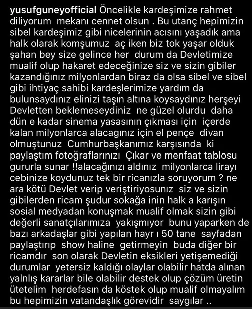 Şahan Gökbakar'ın siyasi rant oyununa bir tepki de şarkıcı Yusuf Güney'den geldi. Yusuf Güney, "Devletimize muhalif olup hakaret edeceğinize siz ve sizin gibiler kazandığınız milyonlardan biraz da olsa Sibel ve Sibel gibi ihtiyaç sahibi kardeşlerimize yardımda bulunsaydınız, her şeyi devletten beklemeseydiniz ne güzel olurdu" diye yazdı.