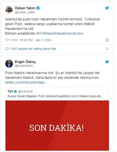 Sosyal medyada bazı CHP'li vekiller, İstanbul Havalimanın hizmet veremediğini ve şu an tek hizmet verebilen havalimanının Atatürk havalimanı olduğu, Rus Devlet Başkanı Putin'in de bu yüzden Atatürk Havalimanına indiğini iddia etti. Oysaki, Atatürk Havalimanı özel uçaklar, kargo uçakları ve devlet protokolü için hala kullanımda. Sosyal medyada küçücük bir arama yapanlar, Cumhurbaşkanı Recep Tayyip Erdoğan başta olmak üzere bazı bakanların da yurt içi ve yurt dışı seyahatlerinde Atatürk Havalimanı'nı kullandıklarını bilgisine ulaşabilirler.