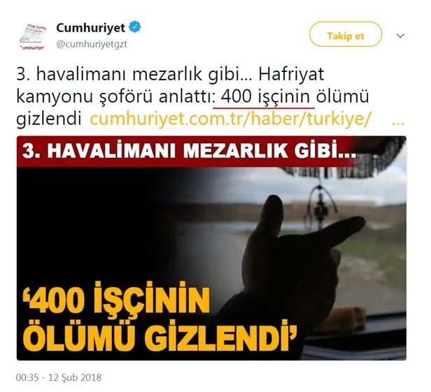 İki yıl önce Cumhuriyet gazetesi, havalimanında çalıştığını iddia eden bir kamyon şoförünün iddiasına dayanarak 400 işçinin inşaatlar sırasında hayatını kaybettiğini yazmıştı.
