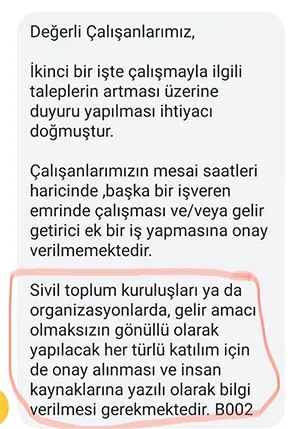 "Değerli Çalışanlarımız, ikinci bir işte çalışmayla ilgili taleplerin artması üzerine duyuru yapılması ihtiyacı doğmuştur. Çalışanlarımızın mesai saatleri haricinde, başka bir işveren emrinde çalışması ve/veya gelir getirici ek bir iş yapmasına onay verilmemektedir. Sivil toplum kuruluşları ya da organizasyonlarda, gelir amacı olmaksızın gönüllü olarak yapılacak her türlü katılım için de onay alınması ve insan kaynaklarına yazılı olarak bilgi verilmesi gerekmektedir."