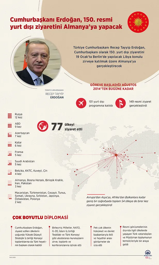 Berlin'de 19 Ocak'taki Libya konulu zirveye katılmak üzere Almanya'ya yapacağı ziyaret, Cumhurbaşkanı Erdoğan'ın 150. resmi gezisi olacak.