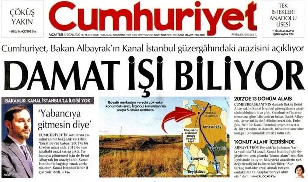 Son dakika haberi... Yalan haberin merkezi Cumhuriyet, "Tartışmalı proje Kanal İstanbul güzergâhında Erdoğan’ın damadının arazi aldığı ortaya çıktı." şeklinde iftiradan ibaret bir habere imza attı. Konuyla ilgili Bakan Albayrak'ın vekili Avukat Ahmet Özel tarafından açıklama yapılarak "Yalan ve iftiradan ibaret birtakım iddialar kamuoyuna haber diye sunulmuştur" denildi.
