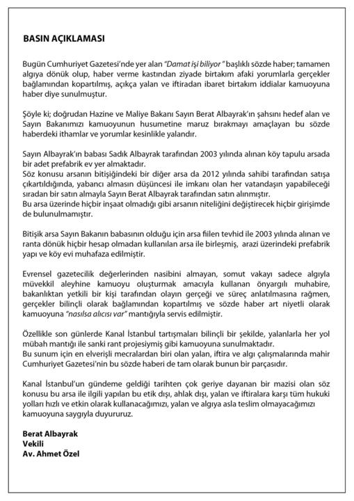 Hazine ve Maliye Bakanı Berat Albayrak'ın vekili Avukat Özel, bugün Cumhuriyet Gazetesi'nde çıkan 'Damat İşi Biliyor' başlıklı haberle ilgili yazılı açıklamada bulundu. Özel, söz konusu haberin iftiradan öteye gidemediğini belirterek, arsanın 2003 yılından bu yana Albayrak ailesinde olduğunu vurguladı.