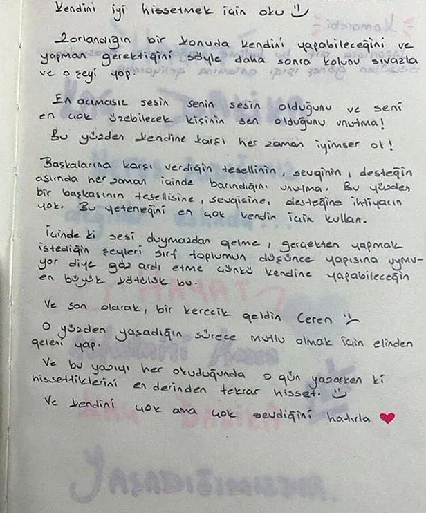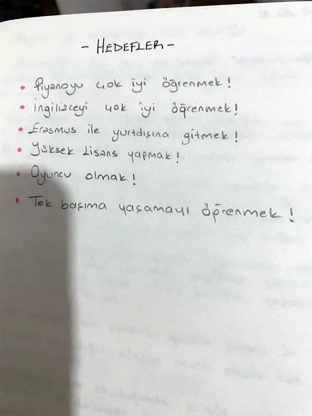 Öte yandan ölümüyle Türkiye'yi hüzne boğan balerin Ceren Özdemir'in kendisine ait bir defteri bulunduğu, bu deftere yıllık planlarını, hedeflerini ve hayallerini yazdığı da ortaya çıktı. Defterdeki yazılı sayfaların fotoğrafları, paylaşıldığı sosyal medyada kısa sürede yayıldı. Ceren Özdemir'in defterindeki hedefler kısmına; piyanoyu ve İngilizceyi çok iyi öğretmek istediğini ERASMUS ile yurt dışına çıkmak istediğini, yüksek lisans yapmak ve oyuncu olmak istediğini belirtip tek başına yaşamayı öğrenmek istediğini yazdı. Ceren Özdemir, yıllık planlar kısmına ise? Kitap okumayı alışkanlık haline getir, yazın çalış, yemek yapmayı öğren, fotoğraf albümü yap, müzik çeşitlerini bil, kitap okumayı alışkanlık haline getir, müzik çeşitlerini bil, siyaset hakkında bilgi sahibi ol? gibi 14 maddeyi de kaleme aldı.